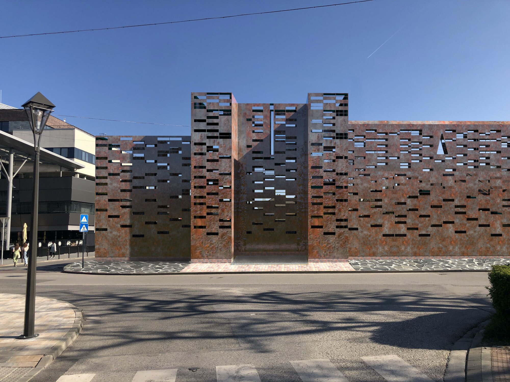 Návrh náznaku hradobnej kurtíny a veže v cortene, Trnava– vizualizácia (autori: Gregorová, Vojteková, Hanzl)