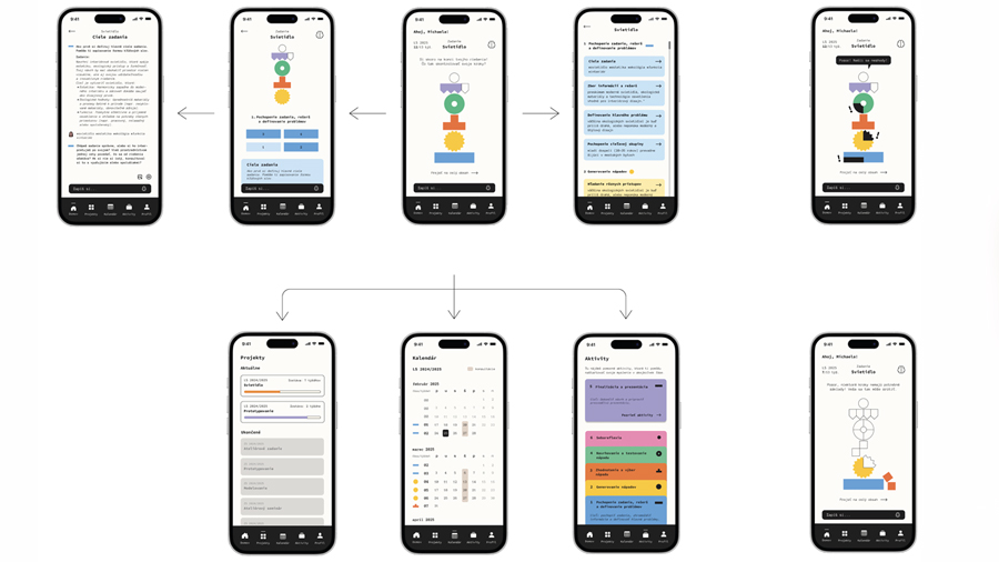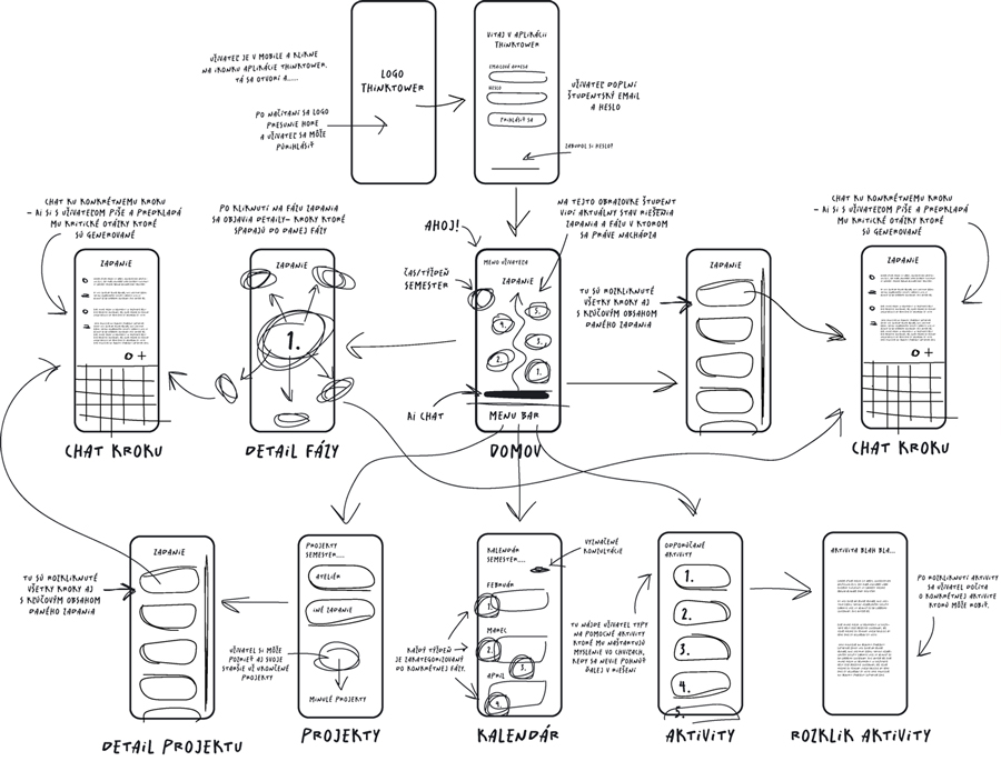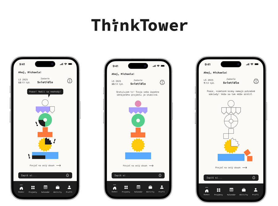 Aplikácia ThinkTower ti pomôže prejsť celým proce-som riešenia (nielen) ateliérového zadania. Plnením krokov postupne skladáš vežu riešenia. Každý krok preverujú kritické otázky a neustále mapovanie obsahu s pomocou umelej inteligencie ustráži, aby sa tvoja veža riešení nezrútila.